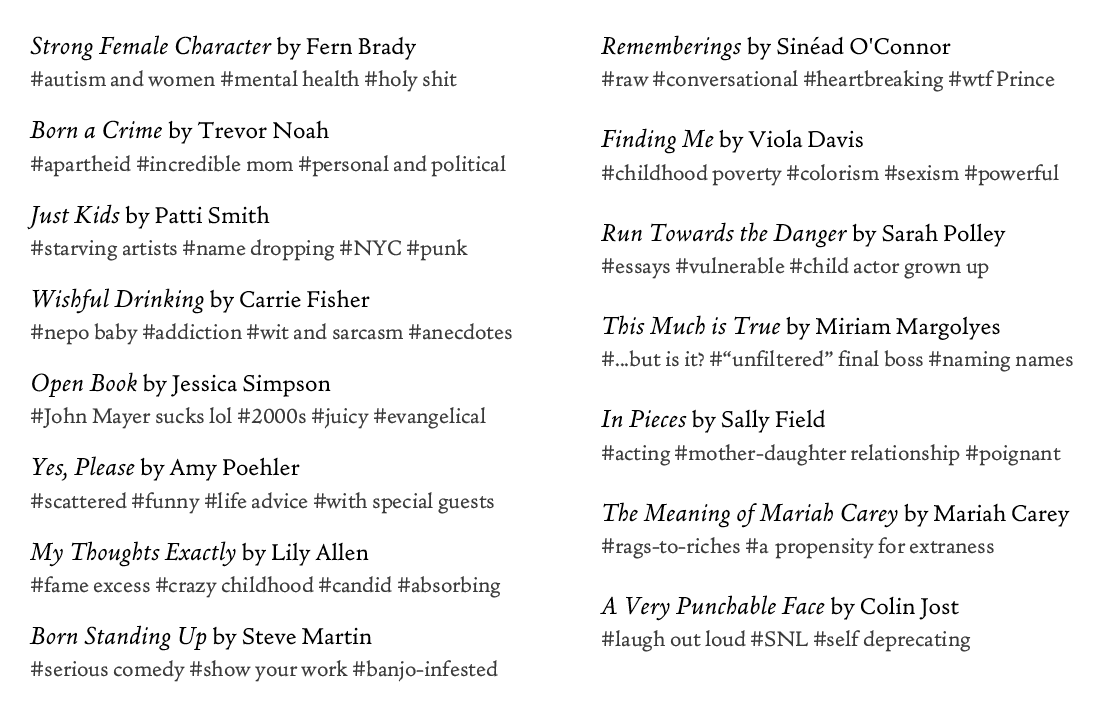 in honour of the late, great podcast Celebrity Memoir Book Club hosted by Claire Parker and Ashley Hamilton (which rebranded this year to Good Noticings and now focuses on general pop culture news), we decided to each choose a celebrity memoir this month.